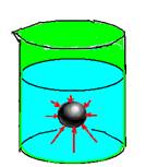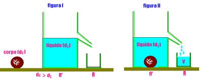 Em seguida o corpo é colocado em R’ e fica totalmente imerso (dc > dl), expulsando um volume de líquido que é igual ao próprio volume do corpo. O volume total (V) do líquido deslocado é recolhido no recipiente R (figura II).