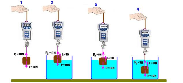 real (Pr) do corpo. Nas figuras 2, 3 e 4, à medida que o corpo vai imrgindo no líquido, o empuxo vai aumentando, pois ele vai deslocando cada vez mais volume de líquido e, o peso aparente (Pa) que é o peso real menos o empuxo (Pa=Pr – E) vai diminuindo e atinge seu valor mínimo, no caso 7N, quando o corpo está totalmente imerso.