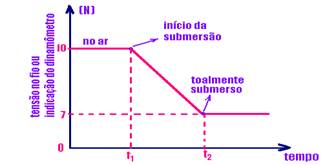 e t2 o corpo está imergindo na água e o peso real vai diminuindo linearmente devido ao empuxo (função do primeiro grau – E=d.V.g) até atingir o valor de 7N, quando fica totalmente submerso --- a partir de t2, para qualquer profundidade o empuxo é constante e o dinamômetro indica 7N.